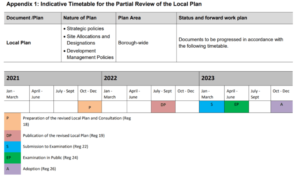 An indicative timetable for the iteration of the Local Plan is set out in the LBH July 2021 Local Development Scheme (and reproduced below).